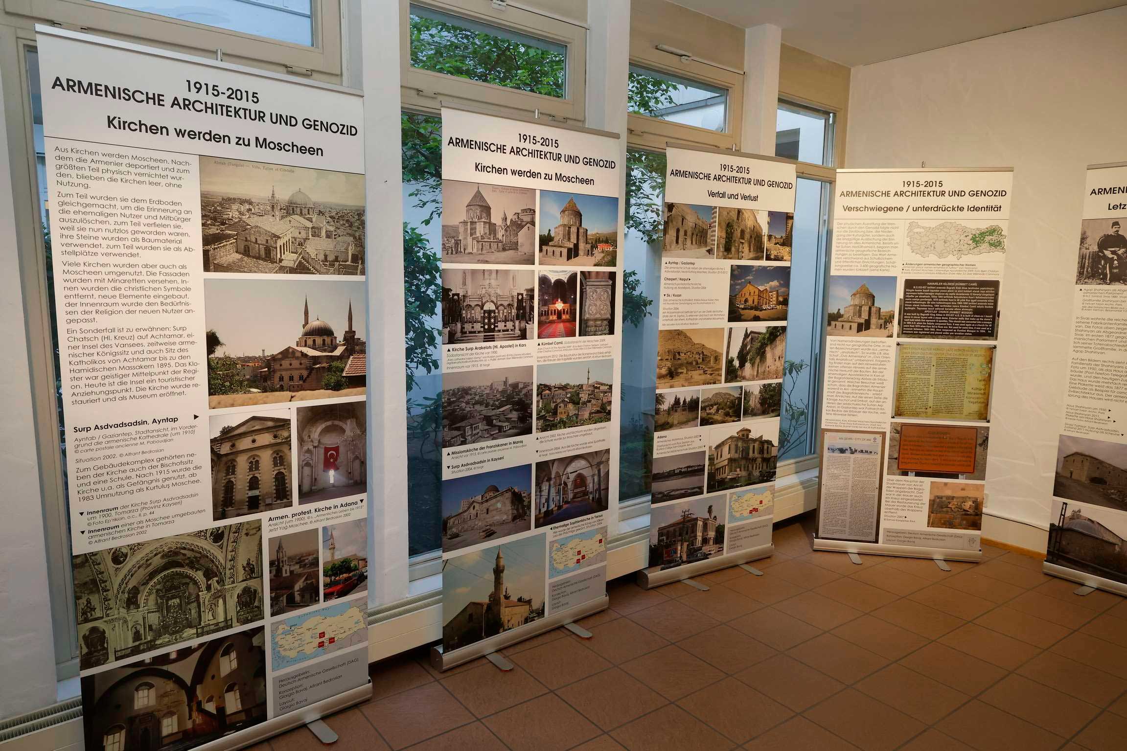 In den Jahren 1915/1916 wurden im Osmanischen Reich bis zu 1,5 Millionen Armenier durch Massaker und Todesmärsche gezielt ermordet. Eine unmittelbare Folge des Völkermords war die systematische Zerstörung des armenischen Lebensraumes. Welche Auswirkungen hatte der Genozid auf das kulturelle Erbe der Armenier in der heutigen Türkei? Diese Frage bildet den Ausgangspunkt der Ausstellung „Verfolgt, vertrieben, zerstört – Armenische Architektur und Genozid“ der Deutsch-Armenischen Gesellschaft. Im Mittelpunkt der Präsentation steht die Zerstörung der armenischen Architektur. Der Prozess betraf alle Bereiche und hatte unterschiedliche Gesichter: von der Enteignung von Wohn- und Geschäftshäusern, der Zerstörung und dem Verfall von Kirchen und Klöstern oder ihrer Umwidmung in Moscheen bis hin zur Tilgung der Erinnerung. Im Extremfall wurden sogar ganze armenische Stadtviertel ausgelöscht.